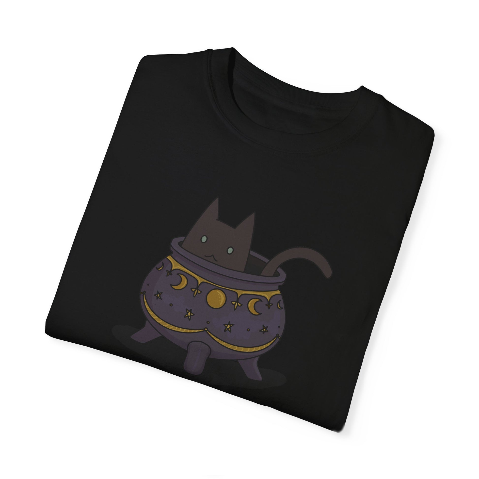 A little magic for your everyday wardrobe. This soft, oversized black tee features a playful black cat peeking out of a cauldron—perfect for adding subtle whimsy to any outfit.